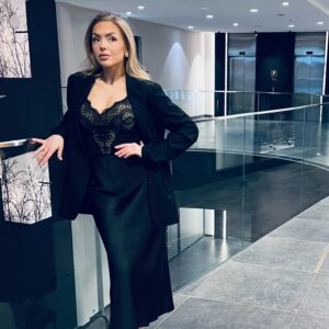 Mežģīnes dekoltē un sēžas daļā piešķir sievišķīgu maigumu.